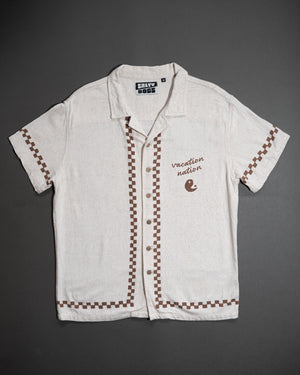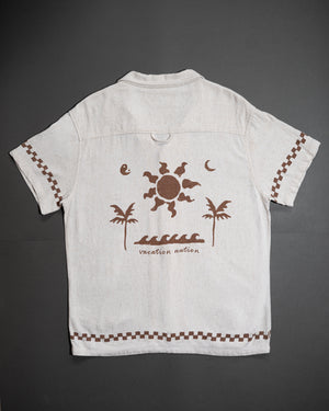 Tiene un ribete a cuadros marrón recorriendo la botonera, el dobladillo y las mangas, más un bordado "Vacation Nation" en el pecho izquierdo. En la espalda, un print con palmeras, sol, olas y luna completa el look playero.